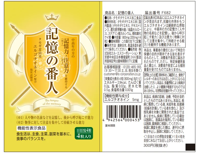 Ergotioneiini toidulisand, mille on turule toonud Jaapani LS Corporation, on toode, mis on mõeldud keskealiste ja eakate inimeste mälu halvenemise raviks.