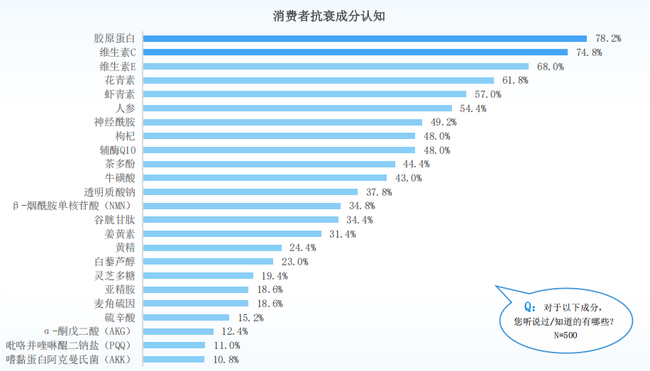 Tänu turu haridusele ja arengule on kollageen praegu tarbijate seas kõrgelt tunnustatud "vananemisvastane koostisosa". Peamiste vananemisvastaste koostisosade mõistmise uuringus on kollageen (78,2%), C-vitamiin (74,8%) ja E-vitamiin (68%) kolm peamist koostisosa, mida tarbijad suukaudsete vananemisvastaste toodete puhul tunnustavad. Erinevate vanuserühmade 5 parima vananemisvastaste koostisosade seas on kollageen kahtlemata "tähtkoostisosa".